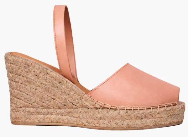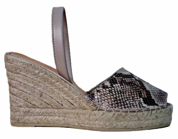 Abarca de corte clasico relizada a mano en piel tanto el material interior como exterior. Planta de vaquetilla natural Cosido con cabo Altura total de 10 centímetros, 7 de cuña y 3 de plataforma.